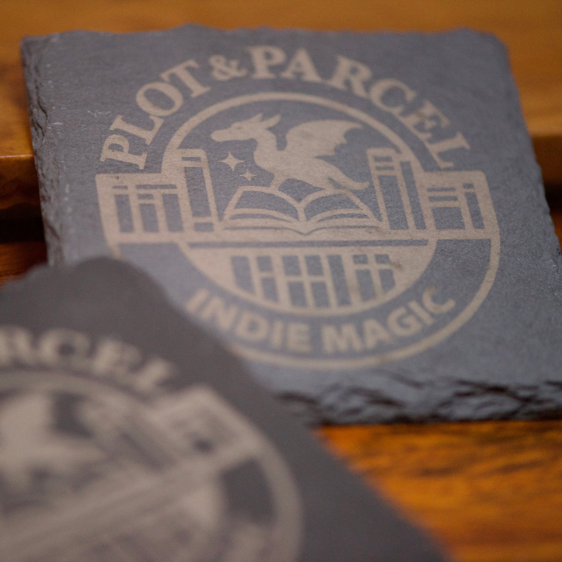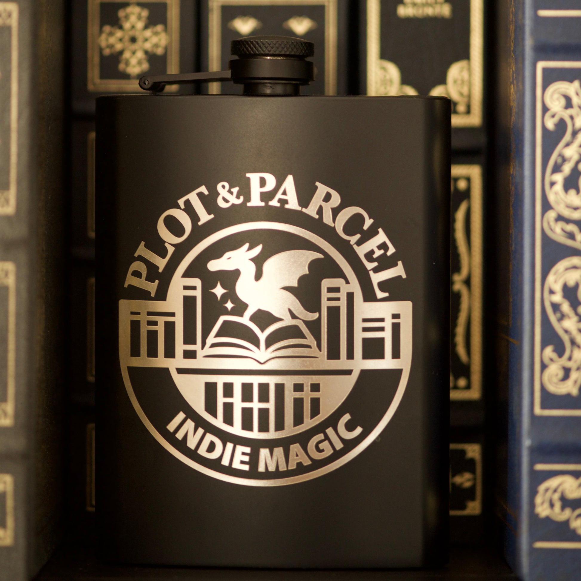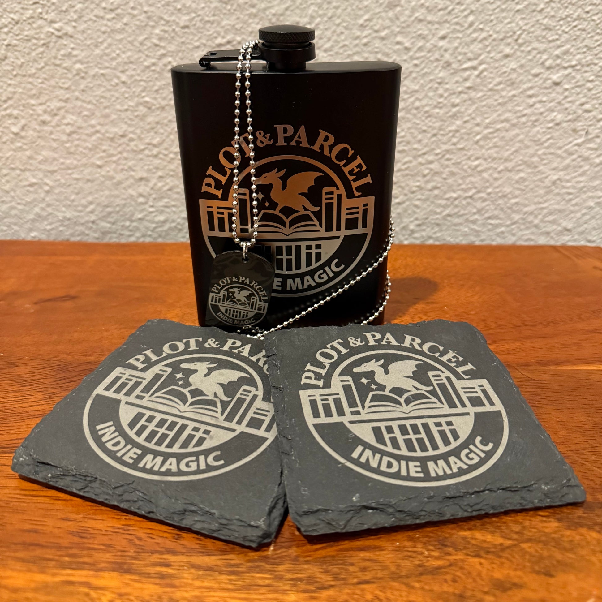 Includes an 8oz stainless steel flask, 2 slate coasters, and a dog tag (27" chain), all emblazoned with the Plot & Parcel logo